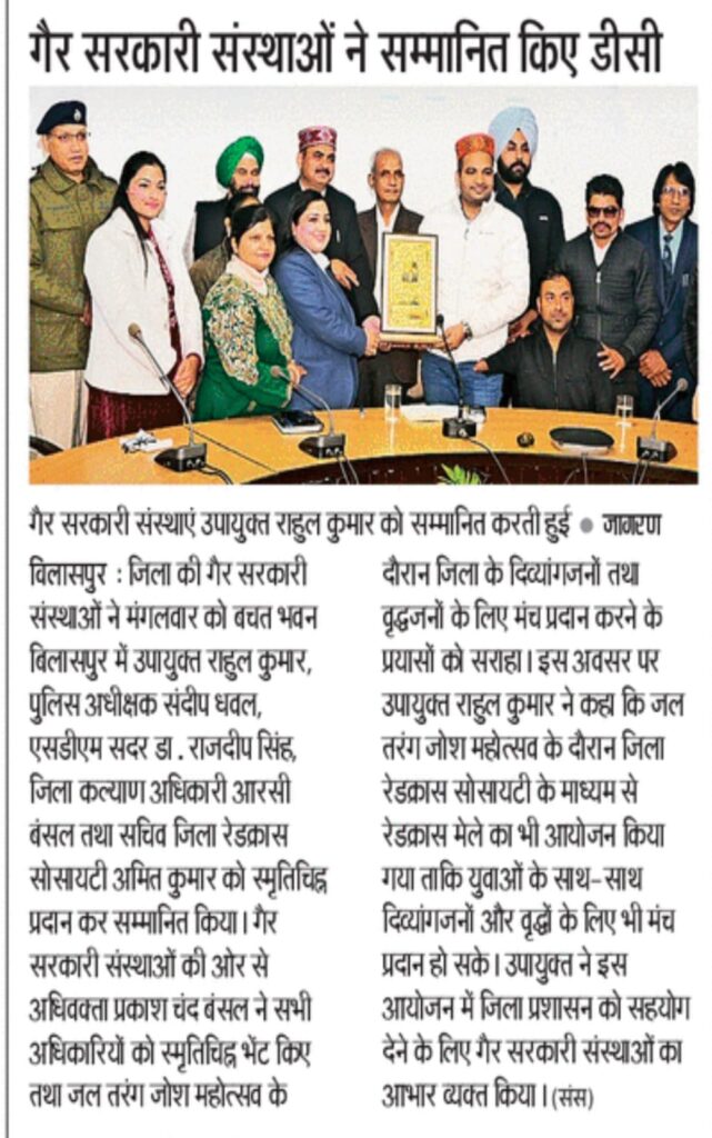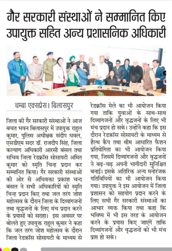 दिनांक 02.12.2025 बिलासपुर: जिले की गैर सरकारी संस्थाओं ने मंगलवार को बचत भवन बिलासपुर में उपायुक्त राहुल कुमार, पुलिस अधीक्षक संदीप धवल, एसडीएम सदर डॉ. राजदीप सिंह, जिला कल्याण अधिकारी आरसी वरेल तथा सचिव जिला रेडक्रॉस सोसायटी अमित कुमार को स्मृति चिन्ह प्रदान कर सम्मानित किया।
